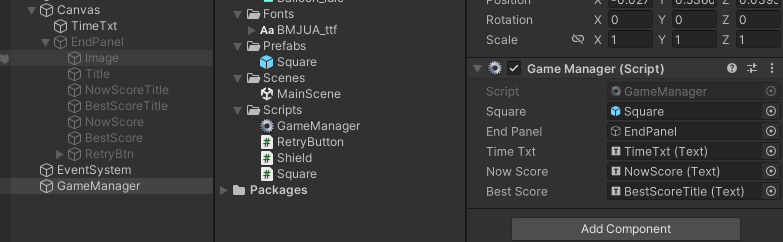 저번에 이어 GameManager 스크립트에 새 변수(최고점수를 표시할 UI/BestScore와 애니메이터)를 추가했다.