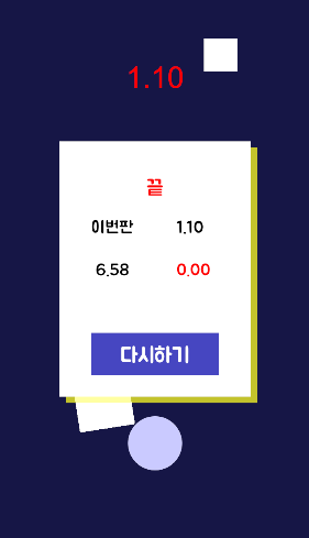 게임오버 창에는 현재점수, 플레이 동안의 최고점수가 뜨며 다시하기 버튼을 통해 게임을 다시 진행할 수 있다.