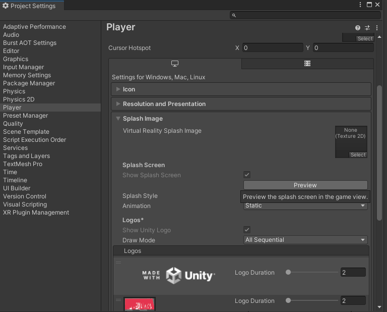 게임이 시작될 때 로고 혹은 게임사의 마크를 넣을 수 있는 곳, 프리뷰를 누르면 게임 창에서도 볼수있다.