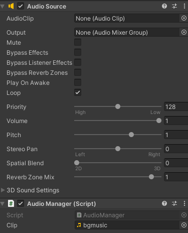 다만 위에서는 audioSource.clip = this.clip; 을 사용하여 컴포넌트에서 직접 지정하지 않았더라도 스크립트에서 설정해줬기 때문에 정상적으로 재생이 가능했다.