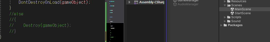 이부분은 시작하는 스타트씬에는 AudioManager 오브젝트는 그대로, 두번째 씬인 메인씬의 컴포넌트를 숨기거나 삭제하면 Destroy 없이도 한개만 계속 재생되는걸 확인하였다.