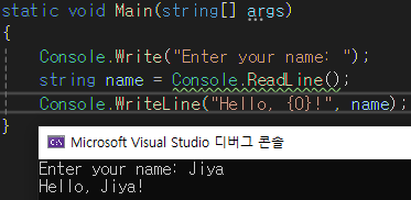Console.WriteLine : C#에서 콘솔 출력할 때 사용하는 메서드, 줄 바꿈 문자열을 추가함