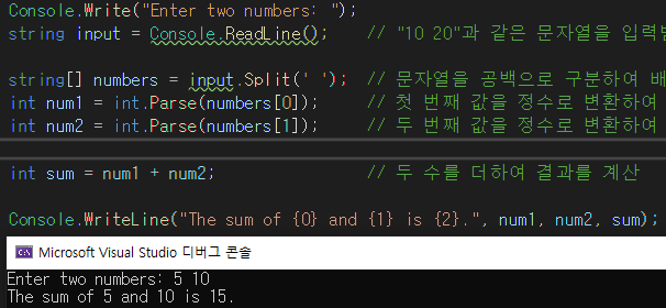 string[] numbers = input.Split(' '); // 문자열을 공백으로 구분하여 배열로 만듬