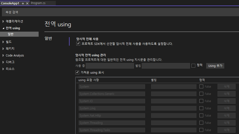 비주얼스튜디오 사용 중 using문이 없어서 신기했다. 유니티에선 스크립트 생성 시 유징문이 그대로 따라왔었는데 여기는 없어도 되는건가 싶었는데 알고보니 프로젝트 > 속성에 보면 자동으로 using이 포함되어있었다.