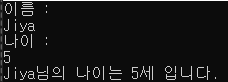 이름 : Jiya, 나이 : 5 로 입력하였을 때 위와 같이 나타난다.
