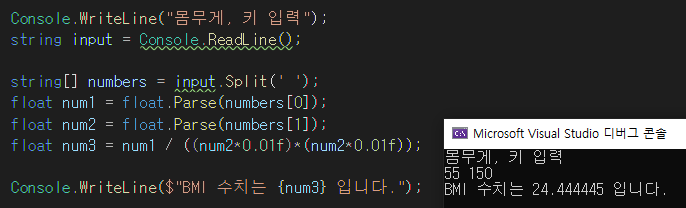 Console.WriteLine($"BMI 수치는 {num3}, 정상체중 입니다.");