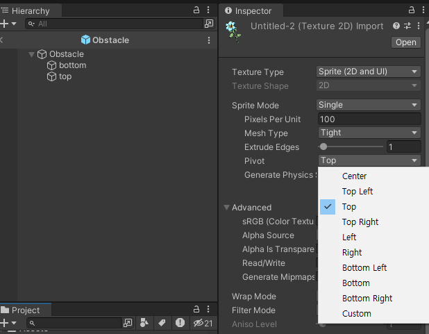 설정에서 Pivot을 top으로 해주었더니 말끔히 해결되었다. 원래는 Center로 되어있어 중앙에서 계속 생성되었기 때문에 아무리 값을 넓혀주고 늘려줘도 중앙 기준으로 생성되어 꽃들이 붙어있던 것이었다.