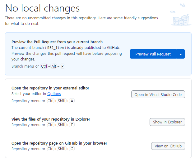 깃 데스크탑에서 맨 마지막 View on GitHub를 클릭하면 깃허브 페이지가 열린다.