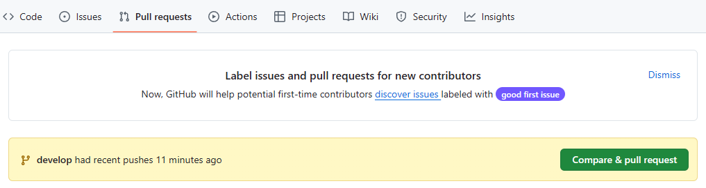 상단의 Pull requests 클릭 후 Compare & pull request 클릭