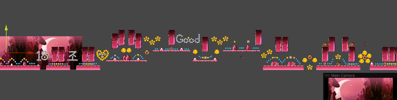 배경은 큰 배경(BackGround), 작은 배경/배경 효과(ForeGround) 두개로 나누었으며 특정 오브젝트가 화면을 벗어나면 앞으로 이동시키는 식으로 배경을 무한 루프하게 해주었다. 배경이 다같은 속도로 움직이면 여러개로 나눈 의미가 없으니 큰 배경은 움직이는 속도를 3, 작은 배경은 1 이런식으로 다르게 해주어 효과를 주었다.