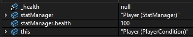 그리하여 =new Condition();을 하면 새로운 Condition 객체가 힙(Heap) 메모리에 생성되고, _health와 같은 Condition의 스탯들은 null이 아닌 실제 객체를 가리키고 있으므로 오류가 사라진 것이었다.