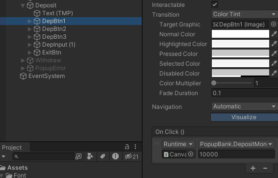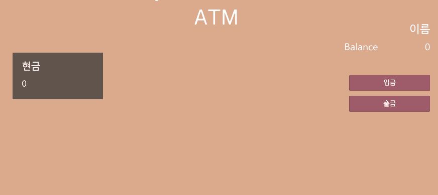 버튼의 경우 이벤트를 DepositMoney(int amount)로 하여 각 버튼에 입력된 금액을 입금할 수 있도록 설정하였고