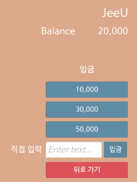 입금 및 출금 화면 버튼은 위와 같으며 입/출금을 원하는 금액을 클릭하거나 InputField에 원하는 금액을 입력 후 입/출금 버튼을 눌러주면 된다.