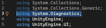 그래서 제일 위에를 보니 System.Diagnostics와 UnityEngine 두개 다 있는것을 확인할수 있었으며 나는 유니티 엔진을 사용하고 있기 때문에 System.Diagnostics를 삭제해줬더니 정상적으로 잘 작동 되었다.
