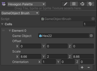 타일맵은 그리드 기반이라 기본 셀 사이즈가 정사각형으로 되어있다. 그런데 내가 사용한 프리펩(게임오브젝트)는 정육각형이라 타일맵과 프리팹의 스케일/배치가 서로 맞지 않아 겹치거나 배열이 이상하게 나오는 문제가 발생했다.