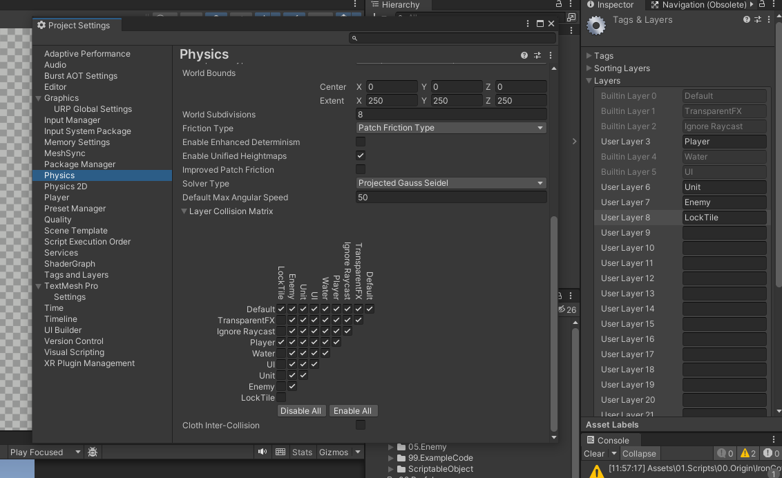 일단 LockTile이라는 레이어를 하나 추가해주고 Project Settings > Physics > Layer Collision Matrix를 이용해 LockTile 레이어는 Player 레이어랑만 충돌할수 있게 해주었다.