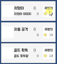 클리키 게임 중 내 역할은 플레이어 능력치 및 업그레이드였고 필수적으로 데이터 테이블을 ScriptableObject를 이용하여 수치 증가량 테이블을 만들고 업그레이드에 따른 능력치를 산출해야 했다.일단 내가 만들어야할 능력치는 치명타, 자동공격, 골드획득량 추가이다.치명타 데미지(공격력 및 확률), 자동공격 로직, 골드획득 로직은 다른분들이 맡아주셨으나 내쪽에서 능력치를 보내주면 그 능력치만큼 기능이 작동될 수 있게 수치를 잘 맞춰야 했다. [CreateAssetMenu(fileName = "PlayerStat", menuName = "Scriptable Object Asset/PlayerStat")] public class PlayerStat : ScriptableObject { Player ..