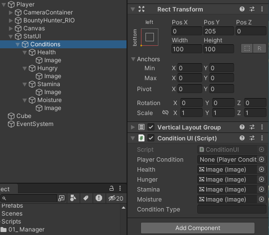 UI 담당은 아니었으나 적용되는 원리에 대해 공부도 할겸 Stat 손대는김에 같이 작성했었다.중간에 이상한곳에 적용하기도 했고 쌩뚱맞게 다른방법도 시도해보고 했었는데 정신없는 나머지 어떤식으로 했었는지 기록하지는 못했다......(ノへ ̄、) using UnityEngine;using UnityEngine.UI;public class ConditionUI : MonoBehaviour{ public PlayerCondition playerCondition; public Image _Health; public Image _Hunger; public Image _Stamina; public Image _Moisture; public string conditionType; p..