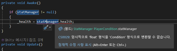 플레이어나 NPC, 적 등 공통적으로 필요한 HP와 같은 스탯을 관리하기 위해 StatManager를 만들어 스탯(Health, Stamina 등)을 관리할수 있게 해주었다그리고 플레이어만의 스탯 관리를 위해 PlayerCondition을 만들어주고 여러 스탯 계산을 용이하게 하기 위해 위해 Condition을 만들어 계산하기 편하게 메서드를 만들어주었다.public class Condition : MonoBehaviour{ public float curValue; public float maxValue; public void Add(float Value) { curValue = Mathf.Min(curValue + Value, maxValue); }}Conditi..